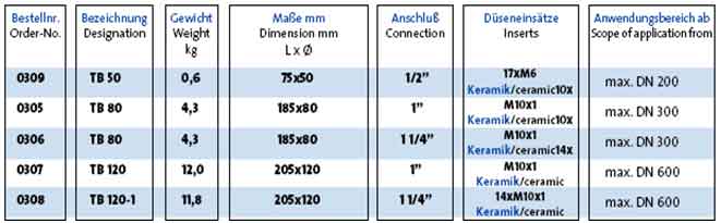 Ειδικό πέλμα για τον καθαρισμό σωλήνων αποχέτευσης με μια πολύ μεγάλη δύναμη πίεσης και απόδοση καθαρισμού. Συνδεδεμένο με ένα ελαφρύ λάστιχο το βάρος και την κατάλληλη απόδοση νερό, αυτό το ειδικό ακροφύσιο μπορεί να καλύψει έως και 400 μέτρα. Κατασκευασμένη από σκληρό χάλυβα. Το ακροφύσιο χωματερή Β 275 είναι ιδιαίτερα κατάλληλη σε επικίνδυνες περιοχές (π.χ. στους στρατώνες με άγνωστο παραμένει). Είναι κατασκευασμένα από ειδικό υλικό και θα είναι απαλλαγμένη από σπινθήρες και πολύ φως. Η γωνία των ακροφυσίων θα είναι 5 ° / 8 ° και σχετικά με το ακροφύσιο χωματερή Β 275 αντίστοιχα μόνο 5 °.Κεραμικά ένθετα θα βρείτε στο κεφάλαιο IV. Προσαρμογείς για τη μείωση ή την αύξηση της σύνδεσης και Περιστρεφόμενες αρθρώσεις σας θα βρείτε στο κεφάλαιο VI.